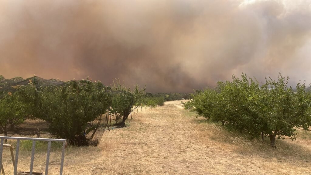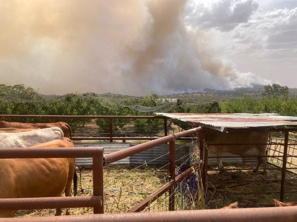 As soon as we knew the catastrophic day was declared, we closed the farm to everyone other than our stay-and-defend crew of Katie, Hugh, and Tess. At 10 am, we met to talk about the day and decided to start enacting our plan by turning on the pump, some orchard irrigation blocks, the misters on the shed and a sprinkler in the stock yards.